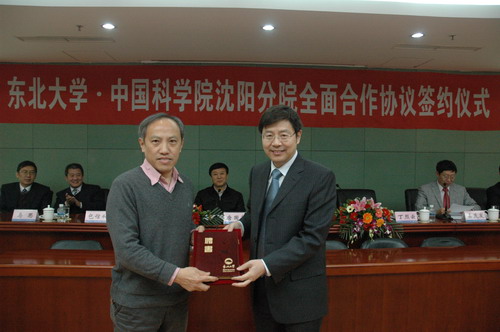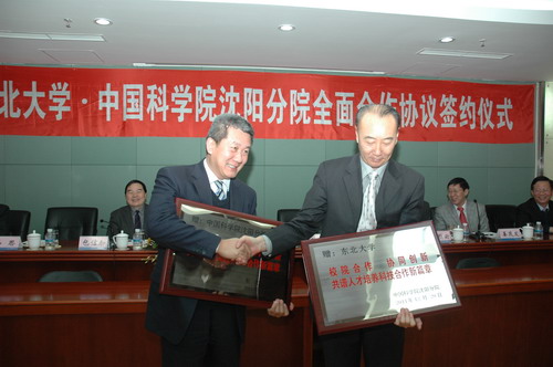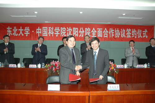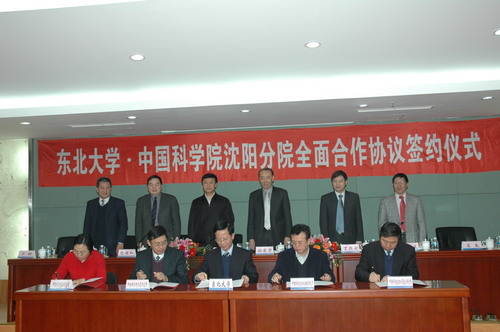 2011年12月20日,在東北大學(xué)漢卿會(huì)堂中國科學(xué)院沈陽分院與東北大學(xué)舉行了全面合作簽字儀式,東北大學(xué)與中科院沈陽分院系統(tǒng)金屬研究所、沈陽自動(dòng)化研究所、海洋研究所和沈陽計(jì)算技術(shù)研究所公司分別簽署了人才培養(yǎng)及科學(xué)研究合作協(xié)議,向首批東北大學(xué)聘請(qǐng)的研究所兼職教授(兼職博士生導(dǎo)師)頒發(fā)了聘書。沈陽分院院長(zhǎng)包信和院士、黨組書記馬思,東北大學(xué)黨委書記孫家學(xué)、校長(zhǎng)丁烈云、副校長(zhǎng)姜茂發(fā)、左良,沈陽分院系統(tǒng)金屬所所長(zhǎng)盧柯院士、沈陽自動(dòng)化所副所長(zhǎng)桑子剛、沈陽計(jì)算所公司董事長(zhǎng)林滸、海洋所等院校領(lǐng)導(dǎo)出席了簽字儀式,受遼寧省副省長(zhǎng)陳超英委托遼寧省科技廳副廳長(zhǎng)唐國華出席簽字儀式并講話,簽字儀式由東北大學(xué)副校長(zhǎng)姜茂發(fā)主持。