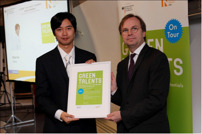 德國聯(lián)邦教研部自2009 年開始舉辦名為“綠色精英——國際可持續(xù)發(fā)展高端論壇”活動。在這個活動中,主辦方邀請全球35 歲以下致力于探索可持續(xù)發(fā)展領域的青年學者參加,通過一個由資深專家組成的評選委員會來進行選拔,評委會著重尋求對解決全球變暖、能源短缺和大規(guī)模環(huán)境污染等具有社會挑戰(zhàn)性的、建設性的解決方案。薛冰博士因在工業(yè)生態(tài)系統(tǒng)領域的研究而獲得評委會的青睞,評委一致認為薛冰的工作對于平衡中國經(jīng)濟增長和可持續(xù)發(fā)展之間的關系具有重要意義。
