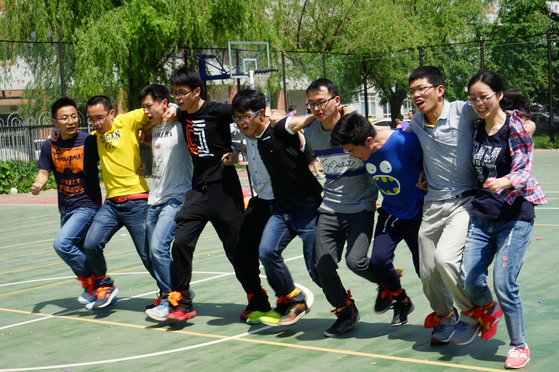 這次趣味運動會得到了各個研究室的大力支持和研究生的廣泛參與,共有八支代表隊、近百人參加比賽。運動會設有“仙人指路”、“集體跳大繩”、“摸石過河”、“女王保衛(wèi)戰(zhàn)”、“十人十一足”等五個項目。在新穎有趣的比賽中,隊員們熱情高漲,觀眾歡呼聲此起彼伏?!凹w跳大繩”項目,十名參賽隊員搖繩有序,猶如飛龍;“仙人指路”項目雙人配合默契,妙趣橫生;“摸石頭過河”項目四人接力,緊張有序;“十人十一足”項目隊員團結向前,彰顯齊心協(xié)力。