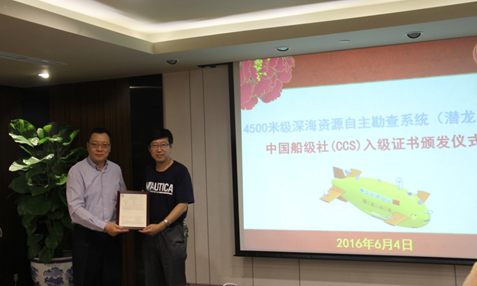 中國船級(jí)社向沈陽自動(dòng)化所頒發(fā)“潛龍二號(hào)”入級(jí)證書