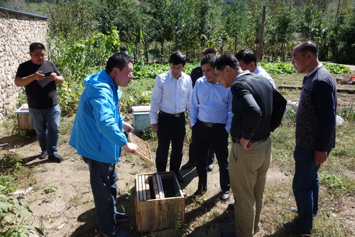 在荒地村的農(nóng)戶家中,沈陽生態(tài)所派駐的科技扶貧干部許思明同志向工作小組展示了科技扶貧重點(diǎn)項(xiàng)目“中華蜂的馴化養(yǎng)殖”實(shí)施效果。據(jù)了解,目前該項(xiàng)目在當(dāng)?shù)剞r(nóng)戶家的推廣情況和效益很好。另一扶貧項(xiàng)目“果樹和林下經(jīng)濟(jì)作物種植”科技示范基地也展示了良好的發(fā)展勢(shì)頭,即將向村民推廣。