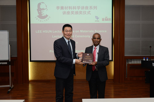 來訪期間,Arumugam Manthiram教授為金屬所科研人員和研究生作了題目為“Next-generation Battery Technologies”的李薰獎(jiǎng)報(bào)告。報(bào)告前,張健副所長代表金屬所為Arumugam Manthiram教授頒發(fā)了李薰講座獎(jiǎng)獎(jiǎng)牌。頒獎(jiǎng)儀式和報(bào)告由劉暢研究員主持。報(bào)告得到了金屬所科研人員和研究生的熱烈歡迎,聽眾紛紛踴躍提問,就感興趣的問題與Arumugam Manthiram教授進(jìn)行討論。來訪期間,Arumugam Manthiram教授與金屬所科研人員和研究生進(jìn)行了深入交流,并參觀了公共技術(shù)服務(wù)部和先進(jìn)炭材料部分實(shí)驗(yàn)室。