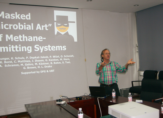 Drake教授在來訪期間首先做了題為“Darwin’s Invertebrates: A Transient ‘Black Box’ Microbial Oasis”的學(xué)術(shù)報(bào)告,詳細(xì)地介紹了他30年以來對(duì)生物與環(huán)境相互作用關(guān)系的理解,重點(diǎn)介紹了蚯蚓腸道如何作為暫時(shí)的微生物生存綠洲,對(duì)不同種類的微生物進(jìn)行選擇性的富集,從而改變土壤中微生物多樣性和結(jié)構(gòu)的過程,并對(duì)整個(gè)過程中的反硝化作用機(jī)理以及溫室氣體生成機(jī)理進(jìn)行了詳細(xì)的闡述。隨后,作為AEM雜志主編,Drake教授又針對(duì)國內(nèi)普遍存在的投稿接收率較低的現(xiàn)象,做了題為“Manuscripts: How To Avoid Headaches”的報(bào)告,耐心解答論文寫作中應(yīng)該注意的問題,詳細(xì)指導(dǎo)如何將獲得的實(shí)驗(yàn)數(shù)據(jù)和結(jié)果總結(jié)為精彩的論文發(fā)表。