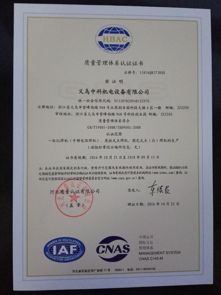 10月21日,中國科學(xué)院沈陽自動化研究所義烏中心控股公司義烏中科機電設(shè)備有限公司獲得ISO9001證書。此前,公司自主研發(fā)、設(shè)計、生產(chǎn)的固定式點焊機、懸掛式點焊機與一體化中頻電阻焊機已獲得中國質(zhì)量認(rèn)證中心《強制性產(chǎn)品認(rèn)證3C證書》(以下簡稱3C認(rèn)證)。