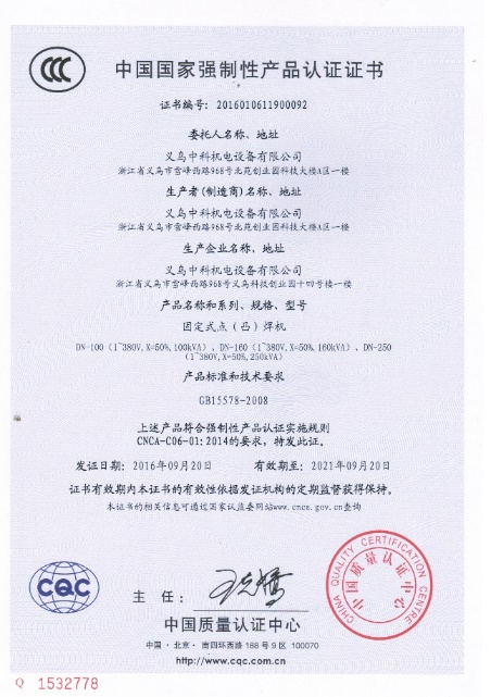 義烏中科機電設(shè)備有限公司自2014年10月以來一直致力于研究點焊行業(yè)新技術(shù)和應(yīng)用發(fā)展新方向,并開始開展3C認(rèn)證工作。公司建立了專業(yè)的軟硬件產(chǎn)品研發(fā)團隊和運維團隊,成立了3C認(rèn)證的專業(yè)小組,針對焊接技術(shù)與應(yīng)用的產(chǎn)品化進行創(chuàng)新性的設(shè)計、試驗與推廣。認(rèn)證的順利通過有力地印證了公司的關(guān)注新產(chǎn)品、自主創(chuàng)新研發(fā)理念。