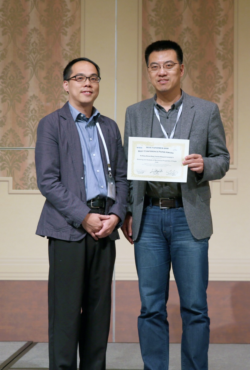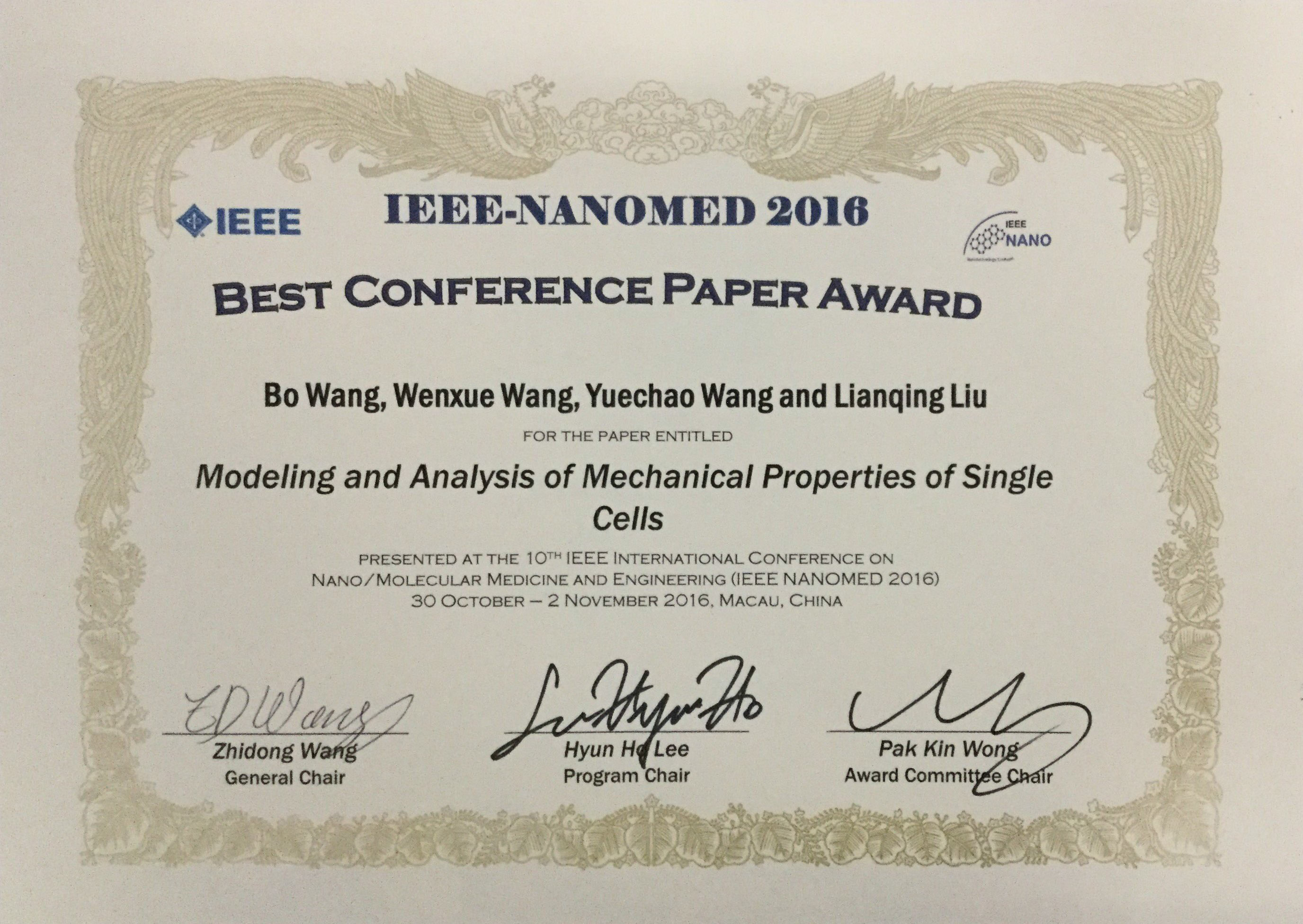 10月31日至11月2日,2016年度IEEE納米/分子醫(yī)學(xué)與工程國際會議(IEEE International Conference on Nano/Molecular Medicine and Engineering, NANOMED)在澳門舉行, 來自世界各地微納米操作、微納生物檢測以及微納米生物醫(yī)學(xué)等科學(xué)研究領(lǐng)域的科學(xué)家參會,展示了上述領(lǐng)域最為前沿的研究成果。中國科學(xué)院沈陽自動化研究所微納米課題組博士生王博等合作完成的論文Modeling and Analysis of Mechanical Properties of Single Cells獲得了本次會議的最佳會議論文獎。