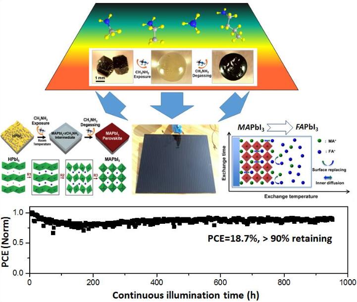 目前常用的有機(jī)-無機(jī)鈣鈦礦材料體系與傳統(tǒng)純無機(jī)太陽能材料區(qū)別在于有機(jī)陽離子的存在,因此如何調(diào)控有機(jī)陽離子實(shí)現(xiàn)大面積高度均勻的鈣鈦礦薄膜制備是一項(xiàng)非常有挑戰(zhàn)的工作。青島能源所青島儲(chǔ)能院自2013年開始一直致力通過對(duì)有機(jī)單元的調(diào)控實(shí)現(xiàn)對(duì)鈣鈦礦材料和器件性能的優(yōu)化,該院研究人員與美國(guó)布朗大學(xué)、美國(guó)可再生能源實(shí)驗(yàn)室緊密合作開發(fā)了甲脒鉛碘新鈣鈦礦材料體系(Chem. Mater. 2014, 26, 1485;Patent: ZL201310257024.0),提出了鈣鈦礦太陽能電池薄膜的氣體修復(fù)技術(shù)(Angew. Chem. Int. Ed. 2015, 54, 9705; J. Am. Chem. Soc., 2016, 138, 750; Angew. Chem. Int. Ed. 2016, 55, 14723;Patent: 2015101841 50.7),這為鈣鈦礦器件從實(shí)驗(yàn)室到商業(yè)化快速過渡奠定了堅(jiān)實(shí)的基礎(chǔ)。