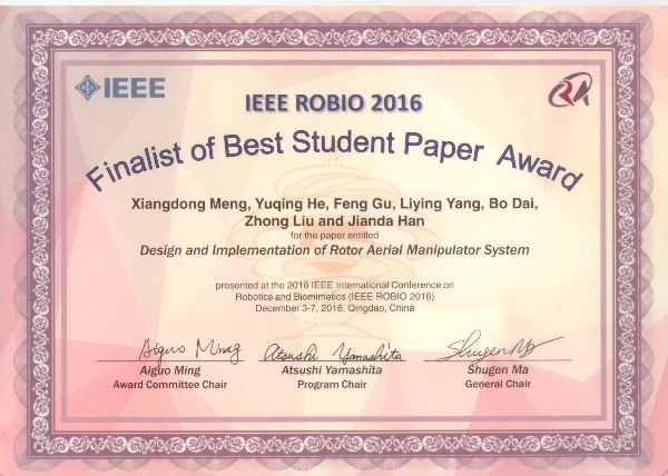 此次分會邀請了來自韓國釜山大學(xué)、新西蘭奧克蘭大學(xué)、大連理工大學(xué)等國內(nèi)外相關(guān)領(lǐng)域的專家,共同交流研究成果。旋翼飛行機(jī)械臂是在現(xiàn)有旋翼飛行機(jī)器人上安裝多自由度操作手臂構(gòu)成的一種新型機(jī)器人系統(tǒng),與會專家針對旋翼飛行機(jī)械臂的相關(guān)研究進(jìn)行了深入的學(xué)術(shù)討論。沈陽自動化所自主機(jī)器人課題組博士研究生孟祥冬、張廣玉展示了研究所在該方向上的最新研究進(jìn)展,即實(shí)現(xiàn)了旋翼飛行機(jī)械臂對運(yùn)動目標(biāo)物的精準(zhǔn)捕獲。其中,孟祥冬等撰寫的論文Design and Implementation of Rotor Aerial Manipulator System獲得ROBIO 2016會議“最佳學(xué)生論文”提名獎(Finalist of Best Student Paper Award)。