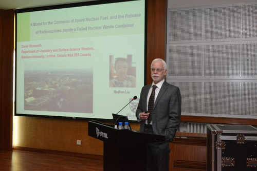 來訪期間,David Shoesmith博士為金屬所科研人員和研究生作了題目為“A MODEL FOR THE CORROSION OF SPENT NUCLEAR FUEL, AND THE RELEASE OF RADIONUCLIDES, INSIDE A FAILED WASTE CONTAINER”的李薰獎報告。報告前,張哲峰副所長代表金屬所為David Shoesmith博士頒發(fā)了李薰講座獎獎牌。頒獎儀式和報告由韓恩厚研究員主持。報告得到了金屬所科研人員和研究生的熱烈歡迎,聽眾紛紛踴躍提問,就感興趣的問題與David Shoesmith博士進行討論。來訪期間,David Shoesmith博士與金屬所科研人員和研究生進行了深入交流,并參觀了沈陽材料科學國家(聯(lián)合)實驗室。