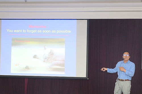 報(bào)告會上,王院士用淺顯易懂的語言生動的講述了記憶的形成、維持和消退的細(xì)胞分子機(jī)制。通過報(bào)告,大家了解到大腦的海馬區(qū)是產(chǎn)生記憶的關(guān)鍵部位。外界環(huán)境信息在神經(jīng)元間的突觸部位以電信號形式進(jìn)行傳遞,突觸傳遞效能具有可塑性,這種可塑性被認(rèn)為與學(xué)習(xí)記憶功能密切相關(guān)。研究表明利用多肽ZIP可以使已經(jīng)形成的記憶消除。通過分子生物學(xué)、電生理和行為學(xué)等實(shí)驗(yàn)手段,王玉田院士研究團(tuán)隊(duì)發(fā)現(xiàn),利用人工合成的多肽GluA23Y可以引起記憶增強(qiáng),這一成果為研究開發(fā)針對阿爾海茨默疾病的臨床藥物提供了可能,為改善和攻克學(xué)習(xí)記憶障礙提供了新的思路。王院士的報(bào)告引起了與會聽眾的廣泛興趣,多位研究生與王院士就人類記憶問題進(jìn)行了交流,獲得大家一致好評。