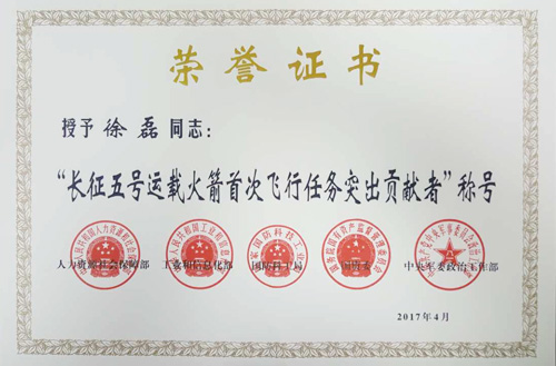 徐磊研究員獲“長(zhǎng)征五號(hào)運(yùn)載火箭首次飛行任務(wù)突出貢獻(xiàn)者”榮譽(yù)稱號(hào)。