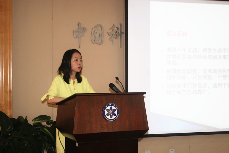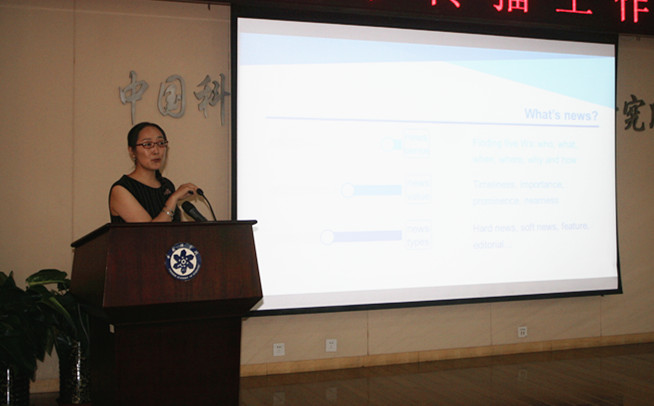 陳娜作了題為"On Science News Writing"的報告,以研究所科研進(jìn)展英文宣傳稿為例,詳細(xì)介紹了英文宣傳稿寫作方式和要求,現(xiàn)場指導(dǎo)科研人員如何運用倒金字塔的寫作技巧寫出重點突出、簡潔明了、吸引受眾“眼球”的新聞稿。
