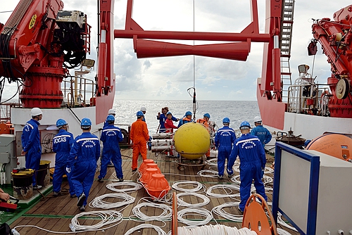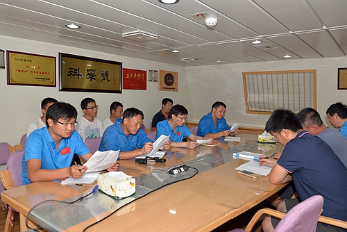 晚七點(diǎn),相關(guān)人員在四樓會(huì)議室召開(kāi)工作例會(huì)。首席科學(xué)家俞建成研究員通報(bào)并總結(jié)了今天的作業(yè)情況,各負(fù)責(zé)人介紹了設(shè)備情況及作業(yè)需求,并與船長(zhǎng)劉合義、調(diào)查隊(duì)長(zhǎng)王昊、船載實(shí)驗(yàn)室主任孫宇峰等人探討確定了下一步具體作業(yè)任務(wù)。航次作業(yè)開(kāi)始后,“科學(xué)”號(hào)堅(jiān)持每天召開(kāi)工作例會(huì)制度,及時(shí)通報(bào)相關(guān)情況,協(xié)調(diào)解決工作中遇到的各項(xiàng)問(wèn)題,合理安排作業(yè)時(shí)間次序,有效促進(jìn)了調(diào)查工作的順利開(kāi)展。