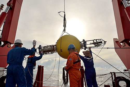 出航第六天,作業(yè)任務(wù)開(kāi)始第三天,大家的配合越來(lái)越默契,各項(xiàng)任務(wù)有條不紊的開(kāi)展。上午四套“海翼”水下滑翔機(jī)順利布放完畢,下午船舶前往距離較近的無(wú)線實(shí)時(shí)化潛標(biāo)布放站點(diǎn)。船載多波束測(cè)線掃描地形后,工程技術(shù)部航次技術(shù)負(fù)責(zé)人盧志君對(duì)數(shù)據(jù)進(jìn)行了快速處理,形成區(qū)域海底地形圖,為潛標(biāo)布放確定了靶區(qū)及中心點(diǎn)。潛標(biāo)布放程序復(fù)雜,需要參與人員多、配合密切,沈陽(yáng)自動(dòng)化研究所人員主動(dòng)提供幫助,由船載實(shí)驗(yàn)室主任孫宇峰統(tǒng)一指揮作業(yè),船長(zhǎng)劉合義、首席科學(xué)家俞建成、調(diào)查隊(duì)長(zhǎng)王昊在作業(yè)現(xiàn)場(chǎng)協(xié)調(diào)人員安排及船舶調(diào)整。下午五點(diǎn)半,無(wú)線實(shí)時(shí)化潛標(biāo)布放完畢。