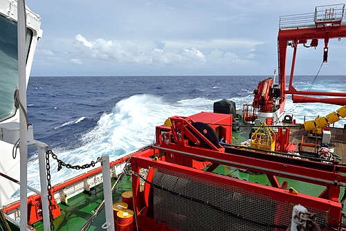 受今年第四號臺風(fēng)“塔拉斯”的外圍影響,作業(yè)海區(qū)的海況逐漸變差,海面上開始遍布白色的浪花,涌浪中能夠感受到船舶明顯的橫搖,后甲板開始上浪,作業(yè)人員全部穿戴救生衣。