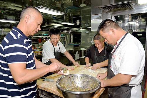 作業(yè)任務(wù)的取消也讓大家獲得了難得的休息時間,緩解近日來連續(xù)作業(yè)的緊張和疲憊??蒲泻图夹g(shù)人員休息的同時,廚房的工作人員卻依然忙碌著。晚飯后,大廚白濱就和廚師王超、華心軍,服務(wù)員任永鵬一起為全船準(zhǔn)備第二天的早餐。和面、拌餡、搟皮,一個個皮薄餡大的鍋貼整齊的碼在盤子里,將成為明早備受大家追捧的早餐。海上工作人員體力消耗大,長時間海上生活的枯燥感又容易使人食欲不振。從想方設(shè)法延長蔬菜保質(zhì)期,到變換花樣制作不同口味的菜品,“科學(xué)”號上的廚師們一直努力在保證營養(yǎng)的同時又能夠讓大家吃得順口?;ň碛蜅l蔥油餅,蒸魚大蝦烤雞翅,總有一款滿足你的胃。良好的伙食保證了每位船隊員能夠有充沛的體力和精力投入到工作中。每次科考任務(wù)的順利完成,離不開他們的辛勤工作。