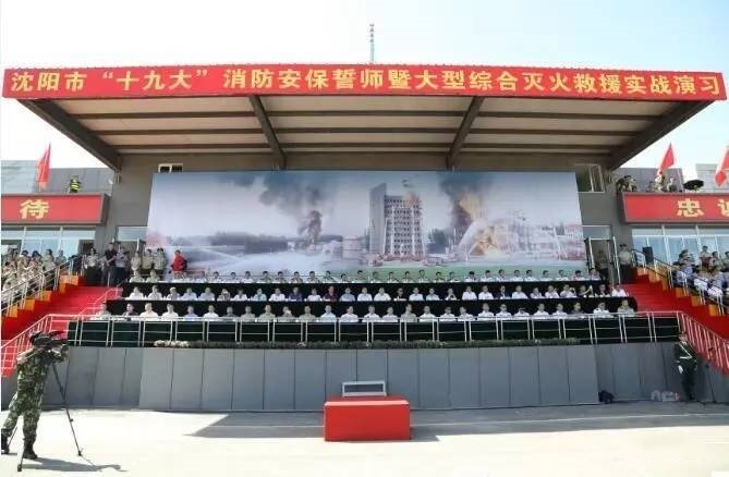 當日上午9點30分,沈陽市“十九大”消防安保誓師暨大型綜合滅火救援實戰(zhàn)演習在消防訓練基地隆重舉行。沈陽市政府各委辦局,全省消防部隊,各區(qū)、縣(市)政府領(lǐng)導(dǎo),市、區(qū)兩級公安機關(guān)、警種支隊領(lǐng)導(dǎo)和社會各界代表共1700多人參加了活動。835名消防官兵,158臺各種消防車輛投入演習。