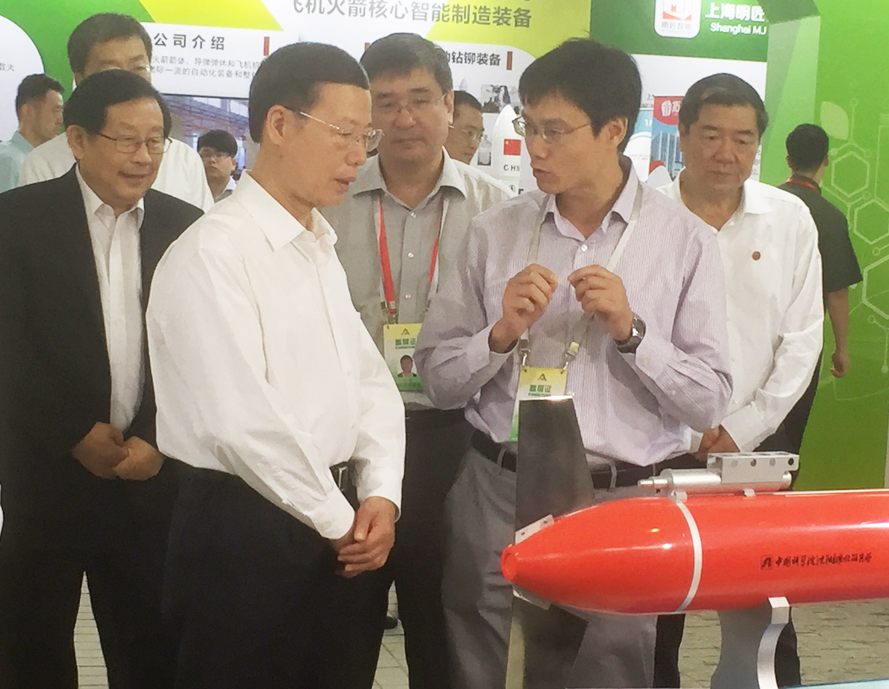 9月15日,2017年全國大眾創(chuàng)業(yè)、萬眾創(chuàng)新活動周主會場在上海楊浦長陽創(chuàng)谷開幕。中國科學(xué)院沈陽自動化研究所“海翼”7000米級水下滑翔機(jī)亮相中國科學(xué)院展區(qū)。中共中央政治局常委、國務(wù)院副總理張高麗參觀了沈陽自動化所展臺。