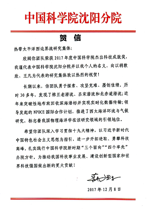 日前,中國科學(xué)院海洋研究所“熱帶太平洋西邊界流研究集體”榮獲2017年度中國科學(xué)院杰出科技成就獎。中國科學(xué)院沈陽分院院長韓恩厚致信海洋研究所,向以胡敦欣、王凡為代表的研究集體表示祝賀。