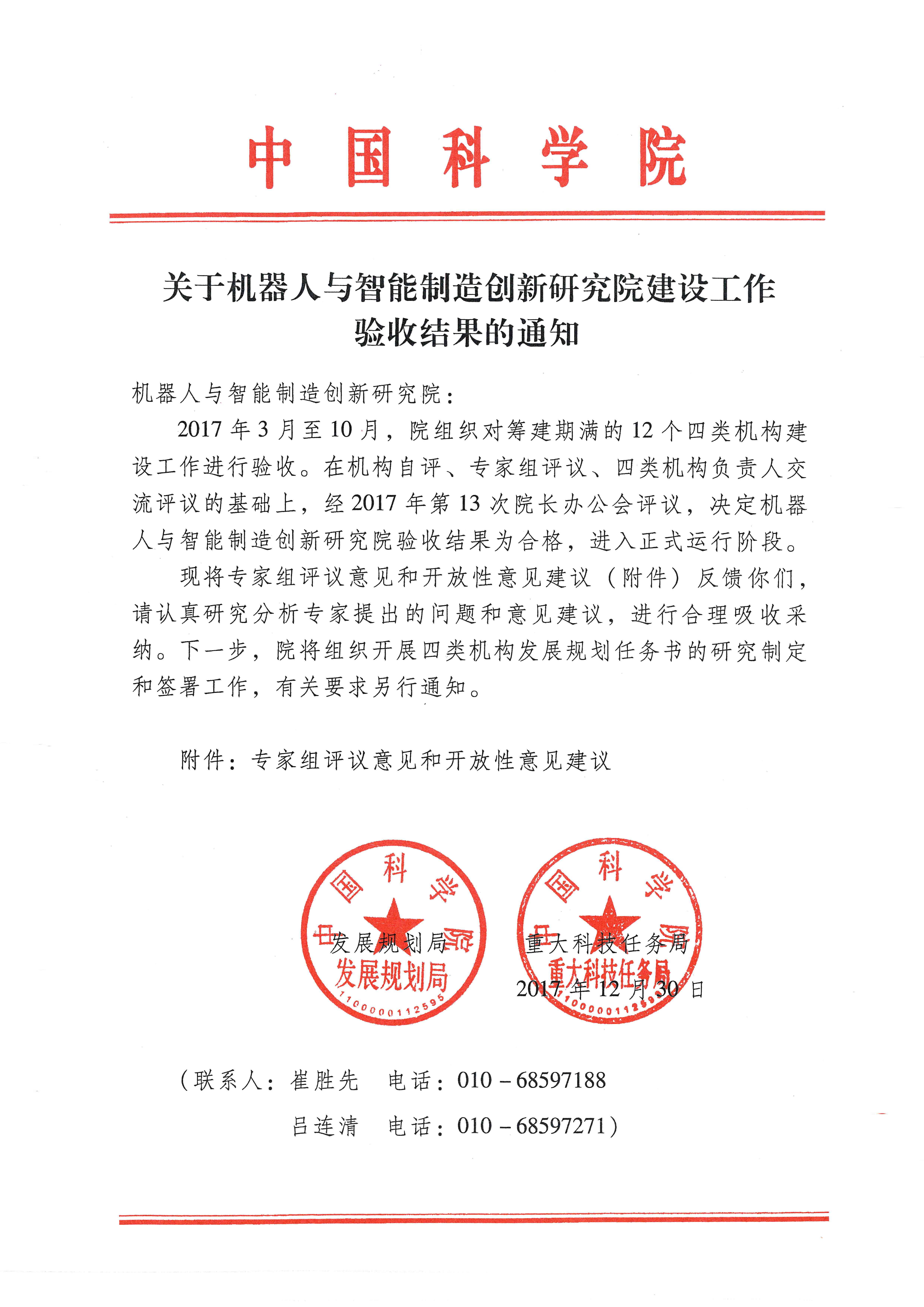 2017年10月11日,中國科學(xué)院機(jī)器人與智能制造創(chuàng)新研究院建設(shè)試點(diǎn)工作專家組驗(yàn)收會舉行,籌建組組長于海斌匯報了創(chuàng)新研究院籌建工作情況。中科院副院長相里斌在驗(yàn)收會上指出“創(chuàng)新研究院定位準(zhǔn)確,領(lǐng)域方向布局合理。機(jī)器人創(chuàng)新院全面完成籌建期目標(biāo)”。近日,經(jīng)院長辦公會評議,決定創(chuàng)新研究院通過驗(yàn)收,進(jìn)入正式運(yùn)行階段。