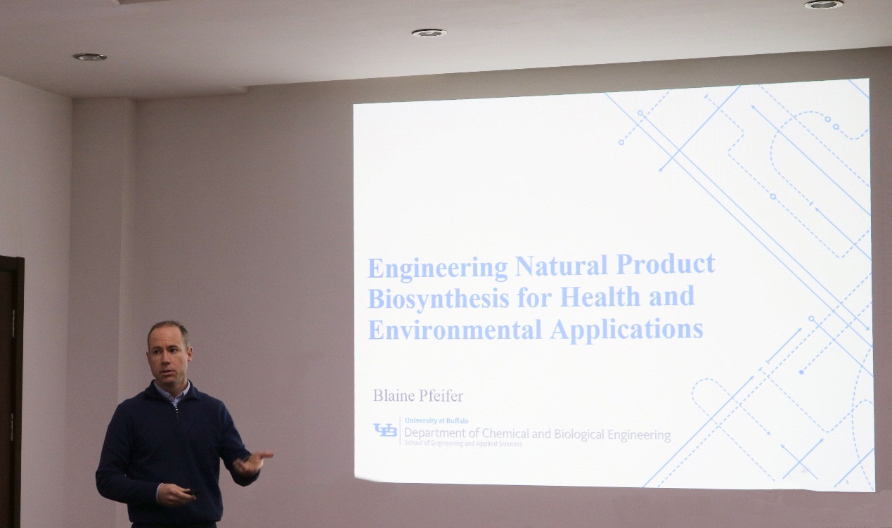 Blaine Pfeifer作了題為“Engineering Natural Product Biosynthesis for Health and Environmental Applications”的學(xué)術(shù)報(bào)告,報(bào)告會由酶工程團(tuán)隊(duì)研究員李盛英主持。Blaine Pfeifer詳細(xì)地介紹了通過構(gòu)建大腸桿菌細(xì)胞工廠異源合成紅霉素和耶爾森桿菌素的研究,并通過基因工程、代謝工程改造滿足其在健康與環(huán)境中的應(yīng)用。報(bào)告結(jié)束后,參會人員就相關(guān)學(xué)術(shù)問題與Blaine Pfeifer進(jìn)行了深入的討論和交流。