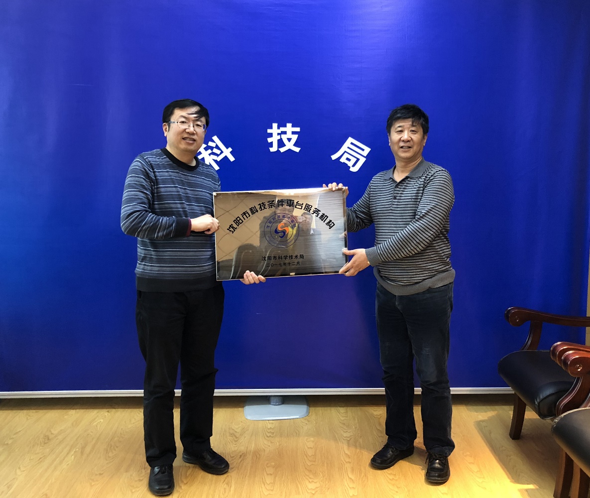 沈陽市科技局科技平臺管理處李輝處長(左)為沈陽自動化所公共技術(shù)服務(wù)中心吳鎮(zhèn)煒主任(右)頒發(fā)牌匾