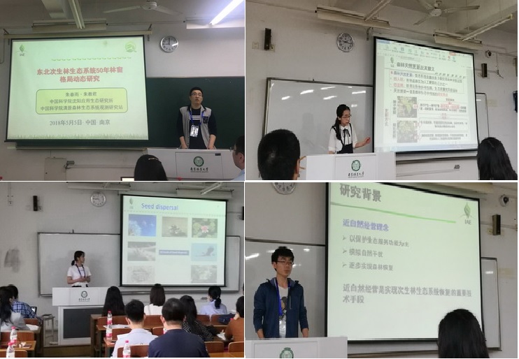 5月5日上午,宋立寧副研究員主持全國生態(tài)學(xué)研究生論壇“森林生態(tài)系統(tǒng)與管理”分會場,博士研究生王靜、盧德亮、張婷在此分會場分別做題為“動物傳播胡桃楸種子對落葉松人工林林分結(jié)構(gòu)變化的響應(yīng)”、“基于林窗干擾的溫帶次生林生態(tài)系統(tǒng)近自然經(jīng)營”、“林窗大小和林窗內(nèi)位置對次生林主要闊葉樹種萌生更新的影響”口頭報告;博士研究生朱春雨在“生態(tài)遙感與應(yīng)用”分會場做題為“東北次生林生態(tài)系統(tǒng)50年林窗格局動態(tài)研究”口頭報告。
