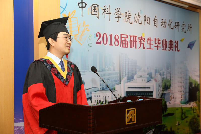 隨后,2018屆博士研究生施佳林代表畢業(yè)生發(fā)言。他回顧了在沈陽(yáng)自動(dòng)化所度過的學(xué)生歲月,表示在能畢業(yè)時(shí)見證研究所的甲子華誕感到無(wú)比的自豪和驕傲,他由衷的感謝每一位導(dǎo)師對(duì)自己的悉心培養(yǎng)和關(guān)懷,并真誠(chéng)祝愿沈陽(yáng)自動(dòng)化所越來越好。