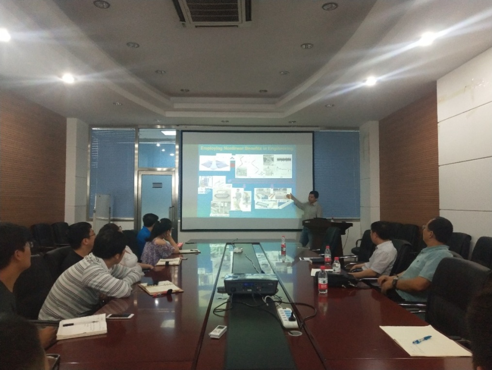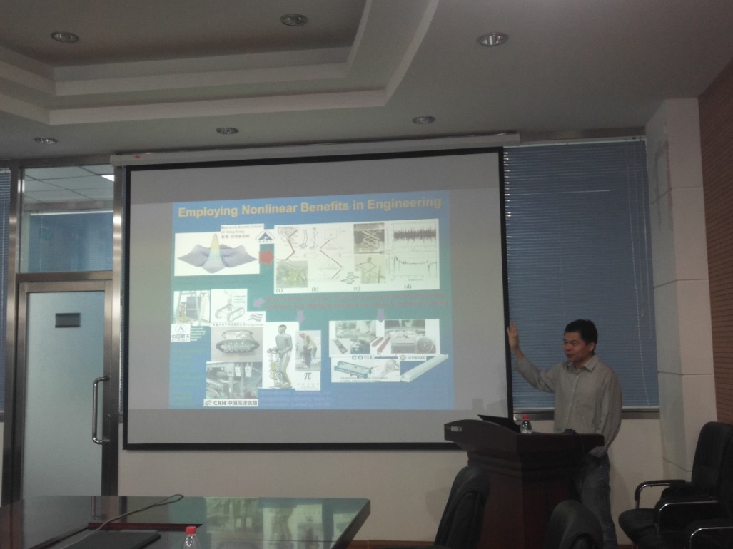 在報告中,景興建首先詳細介紹了各種非線性分析的理論方法,列舉了非線性分析在故障診斷、系統(tǒng)辨識以及減震等方面的具體應(yīng)用,包括用絕對穩(wěn)定性理論進行非線性分析等。隨后,景興建介紹了他在仿生結(jié)構(gòu)方面的研究成果,研制的仿骨骼結(jié)構(gòu)阻尼減震系統(tǒng)已經(jīng)進行大量的理論和實用研究,在多個方面具有應(yīng)用前景。最后,景興建就如何發(fā)表高水平論文進行了講解,他強調(diào)理論創(chuàng)新和研究深度是發(fā)表論文的兩大重要因素,勉勵大家勤于思考,培養(yǎng)創(chuàng)新能力。他分享了自己的親身經(jīng)歷,引發(fā)了與會人員的共鳴,并進行了現(xiàn)場交流。
