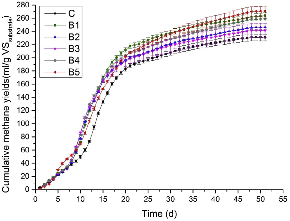 圖1微生物-微氧預處理玉米秸稈累積產甲烷量(B5)