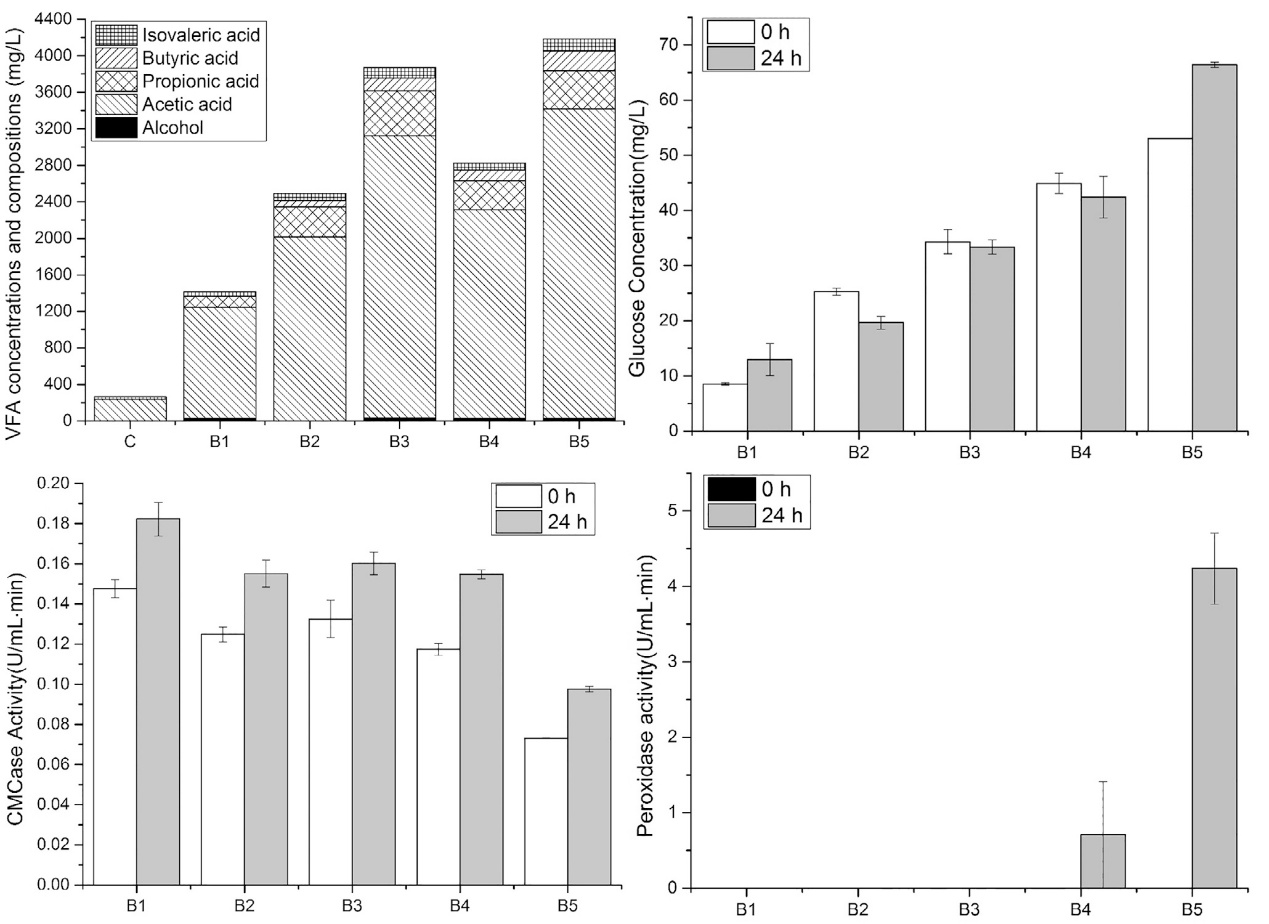 該研究組在近期研究中發(fā)現,利用厚壁菌門中枯草芽孢桿菌(Bacillus subtilis)作為微氧預處理接種物,取代沼液菌群,可提高玉米秸稈厭氧發(fā)酵17.35%的產甲烷量,并將預處理溫度降低至37 。該工作于2018年7月發(fā)表于Bioresource Technology(2018,259,18-23)。與沼液菌群相比,利用Bacillus subtilis純菌液預處理后,產生過氧化物酶,酶活達4.24 U/mLmin;且在24h預處理后,木質素水解率23.0%,半纖維素水解率18.1%,纖維素損失較少。本研究為微生物-微氧預處理強化厭氧發(fā)酵技術的產業(yè)化應用提供理論支持,并為進一步調控代謝途徑以提高纖維素生物質水解率和甲烷產生量提供基礎支持。