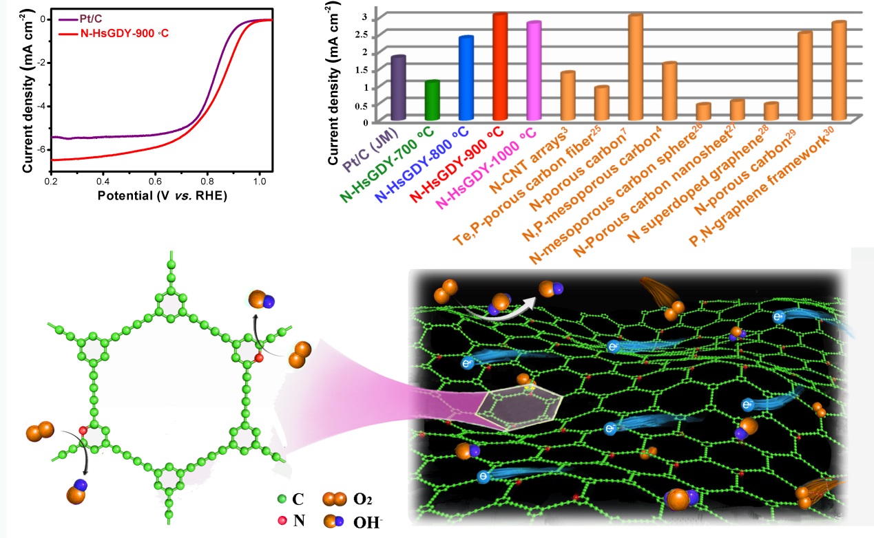 得益于HsGDY的獨特結(jié)構(gòu),在對其進(jìn)行后處理過程中,碳基材料與能源應(yīng)用研究組準(zhǔn)確控制了氮的摻入類型,選擇性摻入對燃料電池陰極電催化最有效的吡啶氮原子,從而實現(xiàn)了優(yōu)異的催化性能。同時,HsGDY具有六邊形的大孔,其分子孔徑達(dá)1.63 nm,有利于催化反應(yīng)過程中反應(yīng)物和產(chǎn)物的傳質(zhì)。通過電化學(xué)測試發(fā)現(xiàn),吡啶氮摻雜的HsGDY在堿性條件下表現(xiàn)出了優(yōu)于商業(yè)碳載鉑催化劑的超高活性。其在0.85 V電位下的電流密度為商業(yè)碳載鉑催化劑的1.6倍,同時具有比碳載鉑更好的穩(wěn)定性和抗甲醇中毒能力。吡啶氮摻雜的HsGDY作為新型燃料電池陰極催化劑替代傳統(tǒng)鉑基催化劑,展現(xiàn)了巨大的潛力。這種通過碳材料結(jié)構(gòu)設(shè)計,實現(xiàn)異原子的準(zhǔn)確摻雜的方法,也為制備其他摻雜型納米材料提供了新的思路。