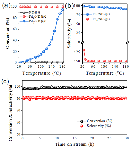 圖 1 催化劑Pdn/ND@G和Pd1/ND@G乙炔加氫反應(yīng)隨溫度轉(zhuǎn)化率(a),選擇性(b)及Pd1/ND@G在180oC催化穩(wěn)定性(反應(yīng)條件:1% 乙炔, 10% 氫氣, 20% 乙烯混合氣,氦氣平衡; 空速(GHSV) = 60000 h-1)