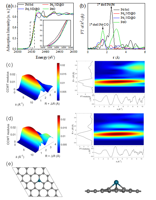 圖3 (a) 鈀X射線吸收近邊結(jié)構(gòu)譜圖;(b) 傅里葉變換后R空間徑向結(jié)構(gòu)函數(shù);(c, d) Pdn/ND@G和Pd1/ND@G的鈀EXAFS振蕩小波變換;(d) 最優(yōu)結(jié)構(gòu)模型圖