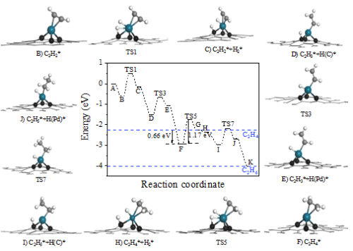 劉洪陽副研究員帶領(lǐng)的研究小組致力于新型納米碳材料負(fù)載金屬催化劑的研究。經(jīng)過多年的學(xué)術(shù)積累,首次利用納米金剛石/石墨烯復(fù)合核殼材料(ND@G)為載體,制備出一種原子級分散高選擇性乙炔加氫Pd基催化劑(圖1)。通過球差電鏡表征(圖2)并結(jié)合X射線吸收譜表征(圖3),證實了Pd在碳載體上的原子級分散形式以及局域配位環(huán)境中的電子結(jié)構(gòu)和化學(xué)成鍵??紤]到實際反應(yīng)體系中氫的參與和結(jié)構(gòu)的穩(wěn)定性,他們構(gòu)建了Pd原子與碳載體三配位成鍵的結(jié)構(gòu)模型,研究了乙炔在此位點的氫化反應(yīng)機(jī)制。利用密度泛函理論(DFT)模擬計算表明,具有單原子Pd活性位點的催化劑,在乙炔氫化反應(yīng)中,更有利于反應(yīng)產(chǎn)物乙烯的脫附,進(jìn)而抑制乙烯進(jìn)一步加氫反應(yīng)的進(jìn)行(圖4)。該項研究為開發(fā)新型高效選擇性加氫催化劑提供了新思路。