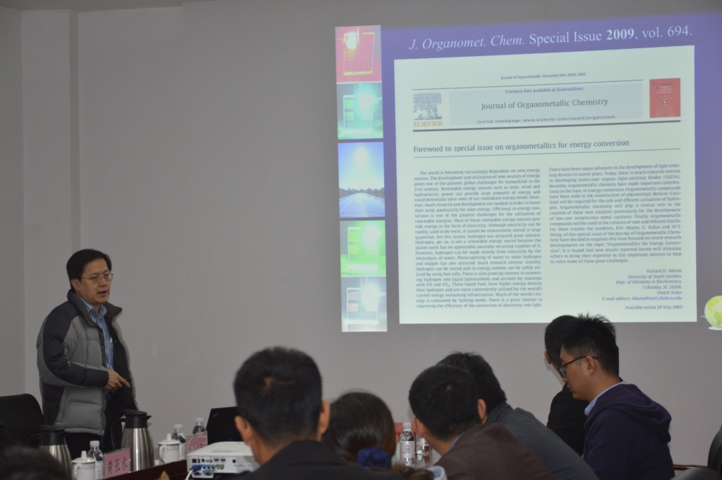 在報(bào)告中,黃維揚(yáng)詳細(xì)地介紹了具有可控光功能和電學(xué)特性的金屬有機(jī)骨架聚合物的研究進(jìn)展。重點(diǎn)介紹了該類材料在光限幅、太陽(yáng)能電池和磁性數(shù)據(jù)存儲(chǔ)中的應(yīng)用。他指出通過(guò)配體官能團(tuán)的修飾實(shí)現(xiàn)主體對(duì)該類材料結(jié)構(gòu)性能的調(diào)控是目前該研究領(lǐng)域的熱點(diǎn)。報(bào)告結(jié)束后,參會(huì)人員就相關(guān)學(xué)術(shù)問(wèn)題與黃維揚(yáng)進(jìn)行了探討和交流。