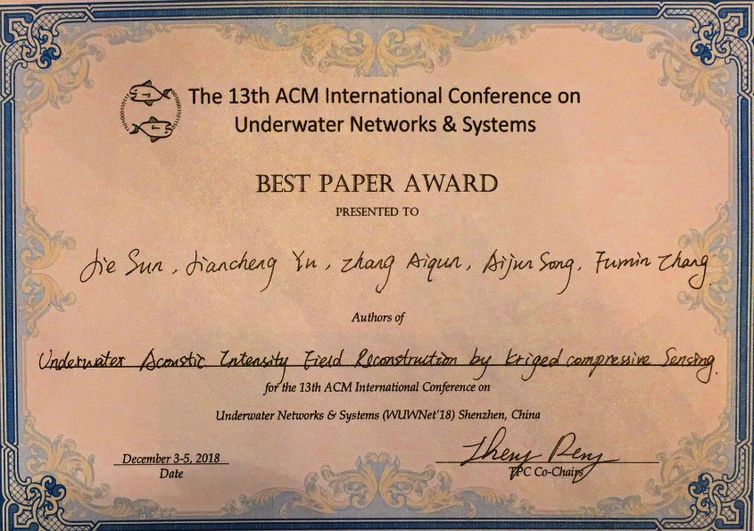 孫潔與沈陽自動(dòng)化所俞建成研究員、張艾群研究員、張福民客座研究員及美國阿拉巴馬大學(xué)宋愛軍教授合著的論文Underwater Acoustic Intensity Field Reconstruction by Kriged Compressive Sensing被會(huì)議組委會(huì)評(píng)為最佳論文,榮獲最佳論文獎(jiǎng)(Best Paper Award)。該論文以多水下移動(dòng)平臺(tái)聲學(xué)測(cè)量為背景,提出克里金-壓縮感知算法,用于水下聲場(chǎng)空間場(chǎng)重構(gòu),獲取高精度聲強(qiáng)空間分布場(chǎng),并應(yīng)用于“海翼1000”聲學(xué)水下滑翔機(jī)海洋環(huán)境噪聲觀測(cè)數(shù)據(jù)處理。