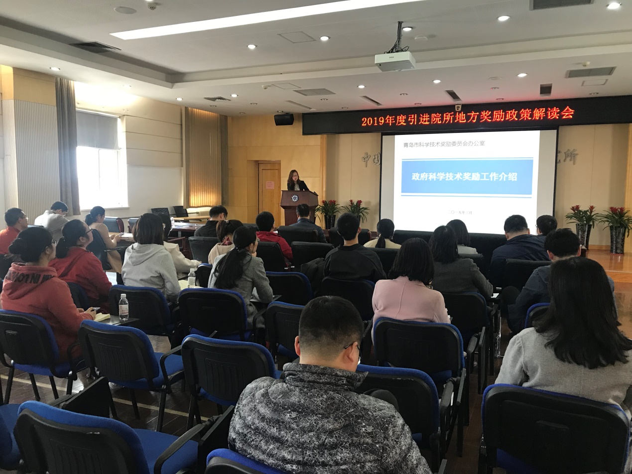 本次會(huì)議以“宣講科技獎(jiǎng)勵(lì)政策,提升獎(jiǎng)勵(lì)申報(bào)質(zhì)量,推動(dòng)駐青院所服務(wù)地方發(fā)展”為主題,特邀請青島市科學(xué)技術(shù)獎(jiǎng)勵(lì)委員會(huì)辦公室徐文匯對國家、省、市各級(jí)科技獎(jiǎng)勵(lì)制度改革舉措、獎(jiǎng)勵(lì)評(píng)審流程以及如何提高報(bào)獎(jiǎng)質(zhì)量等相關(guān)內(nèi)容進(jìn)行了講解,并重點(diǎn)針對2019年山東省及青島市獎(jiǎng)勵(lì)組織申報(bào)工作與參會(huì)人員進(jìn)行交流和答疑。