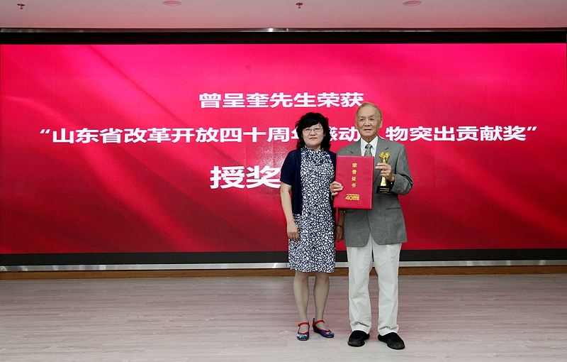 曲偉部長向曾院士家屬頒發(fā)“山東省改革開放四十周年感動人物突出貢獻(xiàn)獎”