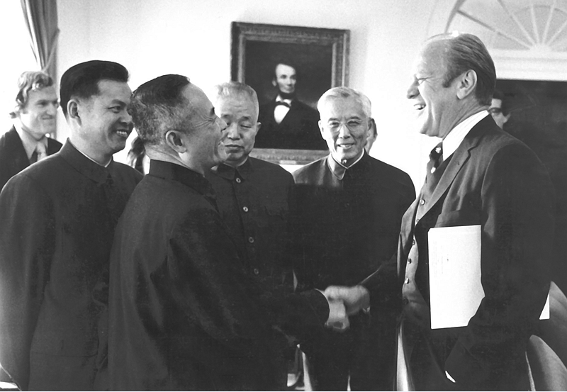 1975年7月以周培源(右2)為團(tuán)長、曾呈奎(右4)為副團(tuán)長的中國科學(xué)技術(shù)代表團(tuán)訪美,美國總統(tǒng)福特(右1)在白宮接見代表團(tuán)