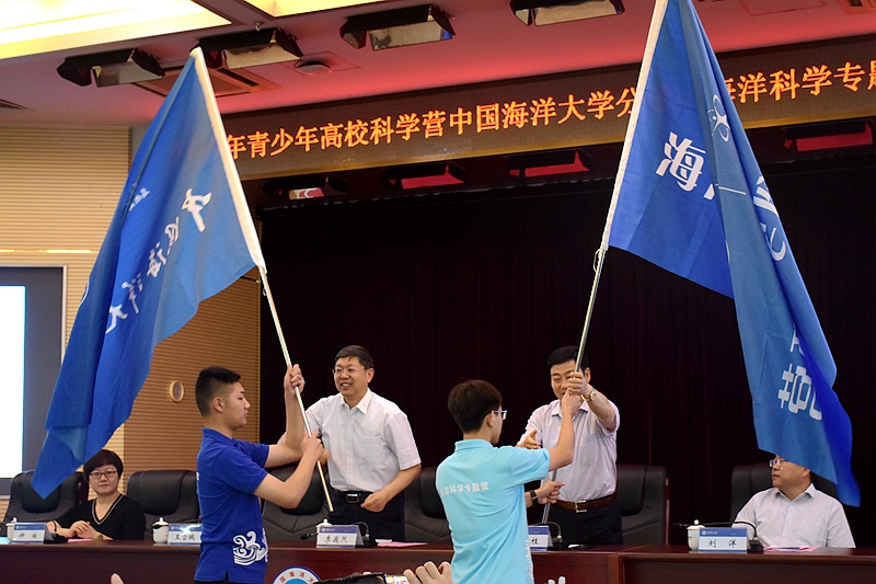 儀式上,李巍然、劉岳桂共同為青少年高??茖W(xué)營海洋科學(xué)專題營、中國海洋大學(xué)分營營員代表授旗,劉岳桂宣布開營。