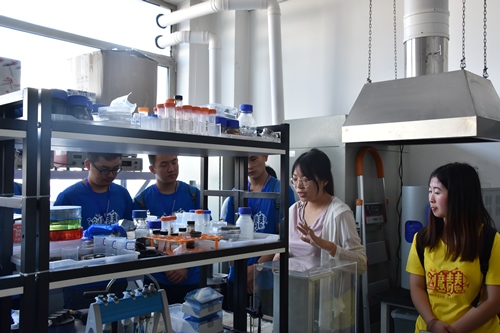 今年在研究生教育大廈一樓舉辦的研究部交流環(huán)節(jié)更是一場學(xué)術(shù)交流盛宴,各研究部通過海報展示了學(xué)術(shù)隊伍、科研設(shè)備、科研項目、研究生培養(yǎng)等各方面的豐碩成果,更有老師和師兄師姐們準(zhǔn)備了紙質(zhì)材料和PPT演示,與營員們面對面地深入交流,幫助大家了解各個研究方向,以便做出最適合自己的選擇。在研究部體驗環(huán)節(jié),各研究室為同學(xué)們的到來做足了功課,詳細(xì)地介紹了各自研究室的基本情況、研究方向以及各自研究領(lǐng)域的最新進展。更重要的是,營員們有機會參觀一臺臺精密的實驗設(shè)備,親自動手完成一個個小實驗,感受神秘而真實的科研氛圍。實驗室里氣氛活躍而熱烈,營員們紛紛就自己感興趣的問題廣泛交流、深入探討。