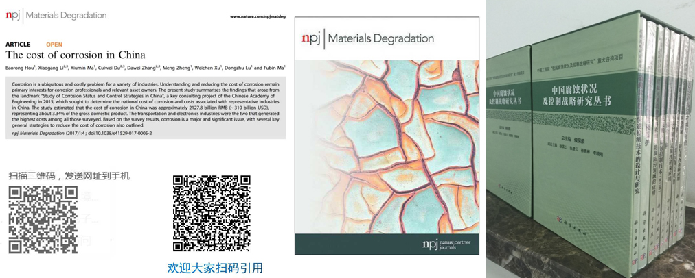 此外,關(guān)于中國腐蝕成本的研究成果和相關(guān)論文以“The cost of corrosion in China”為題發(fā)表在Nature子刊《npj Materials Degradation》(B. Hou, et al. 2017, 1, Article number 4). 同時,在本項目完成結(jié)題時,以徐匡迪院士、丁仲禮院士、周濟院士為顧問,侯保榮院士為總主編,出版腐蝕相關(guān)專著共計32部,并已由科學(xué)出版社正式出版發(fā)行。