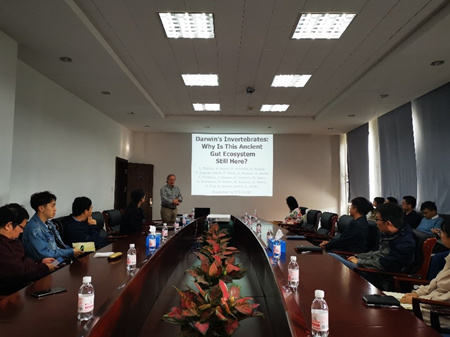 Drake首先做了題為“Darwin’s Invertebrates: Why Is This Primitive Gut Ecosystem Still Here?”的學(xué)術(shù)報(bào)告,詳細(xì)介紹了他40年以來對(duì)生物與環(huán)境相互作用關(guān)系的理解,重點(diǎn)介紹了蚯蚓腸道如何作為暫時(shí)的微生物生存綠洲,提供豐富的碳源;如何對(duì)不同種類的微生物進(jìn)行選擇性的富集,改變土壤中微生物多樣性和結(jié)構(gòu)的過程,并對(duì)整個(gè)過程中的反硝化作用、甲烷合成作用、發(fā)酵過程以及溫室氣體生成機(jī)理進(jìn)行了詳細(xì)的闡述。隨后,Drake根據(jù)多年擔(dān)任AEM期刊主編的審稿經(jīng)驗(yàn),做了題為“The Art of Scientific Publishing”的報(bào)告,特別指出科研工作者要具備應(yīng)有的學(xué)術(shù)道德,耐心講述論文寫作中應(yīng)該注意的問題,詳細(xì)指導(dǎo)如何將選擇題目、編寫摘要,如何將獲得的實(shí)驗(yàn)數(shù)據(jù)和結(jié)果總結(jié)為精彩的論文并成功發(fā)表。