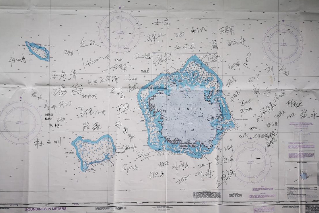 經(jīng)過四十多天的并肩奮斗,來自不同單位的科考人員從陌生到熟悉,結(jié)下了深厚的友誼。部分科考隊(duì)員已經(jīng)完成航次任務(wù),將在靠港波納佩后返程回國。在“科學(xué)”號(hào)“海上堡壘”臨時(shí)黨支部書記杜玉剛同志提議下,全體船隊(duì)員在一張舊海圖上簽下自己的名字,把這段難忘的出海經(jīng)歷及深厚友誼定格在海圖上。
