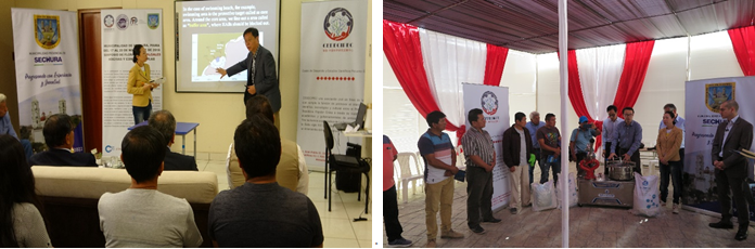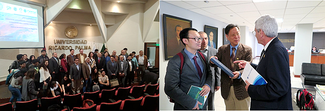 團(tuán)隊(duì)受邀訪問里卡多帕爾馬大學(xué)和卡耶塔 諾埃雷迪亞大學(xué)期間舉辦兩場學(xué)術(shù)報(bào)告會(huì),袁涌銓博士和宋秀賢研究員分別作了題為“改性粘土治理赤潮技術(shù)與應(yīng)用”和“改性粘土治理赤潮技術(shù)的生態(tài)效應(yīng)”的報(bào)告,得到與會(huì)人員一致好評(píng)。中方團(tuán)隊(duì)還與里卡多帕爾馬大學(xué)校長Ivan Rodriguez博士、卡耶塔 諾埃雷迪亞大學(xué)學(xué)術(shù)副校長Alejandro Bussalleu博士就雙方未來的合作開展了友好交流。