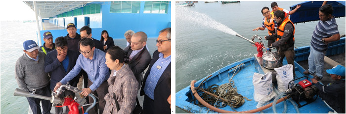 俞志明團(tuán)隊(duì)與以皮烏拉省資政Virgilio Laureano、副省長Marco Purizaca、塞丘拉市市長Justo Eche為首的當(dāng)?shù)睾Q蟆⒆匀毁Y源、經(jīng)濟(jì)等多個(gè)部門管理者、大學(xué)和研究機(jī)構(gòu)人員及養(yǎng)殖業(yè)代表,舉行兩場正式會(huì)晤。與會(huì)省、市各級(jí)領(lǐng)導(dǎo)在聽取中方改性粘土技術(shù)報(bào)告以及當(dāng)?shù)仄髽I(yè)及養(yǎng)殖戶發(fā)言后,對(duì)中方的赤潮治理技術(shù)予以充分肯定,并表示將聯(lián)合當(dāng)?shù)卮髮W(xué)、養(yǎng)殖農(nóng)戶、相關(guān)企業(yè)共同推進(jìn)項(xiàng)目落地。