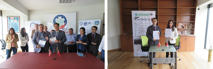 俞志明團(tuán)隊(duì)在首都利馬分別與秘魯-中國科學(xué)研究發(fā)展中心、國際知名健康集團(tuán)A&C Scientific秘魯分部Acinterlab簽署“關(guān)于中國改性粘土治理赤潮技術(shù)在秘魯推廣應(yīng)用的戰(zhàn)略合作協(xié)議”與“授權(quán)中國改性粘土技術(shù)相關(guān)產(chǎn)品在秘魯?shù)莫?dú)家代銷協(xié)議”。