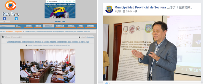 此次活動(dòng)是首批材料和設(shè)備運(yùn)抵秘魯后進(jìn)行的技術(shù)服務(wù)與現(xiàn)場示范。除舉辦技術(shù)服務(wù)報(bào)告會(huì)、進(jìn)行改性粘土治理赤潮的現(xiàn)場示范等活動(dòng)外,代表團(tuán)還受到秘魯前衛(wèi)生部長Eduardo Yong博士接見并拜訪了中國駐秘魯大使館,接受了“Piura News”“La Hora”等當(dāng)?shù)刂髁髅襟w專訪,相關(guān)活動(dòng)在塞丘拉市政廳、UPCH水產(chǎn)養(yǎng)殖研究所等機(jī)構(gòu)官方網(wǎng)站及媒體平臺(tái)上進(jìn)行了報(bào)道,標(biāo)志著具有我國自有知識(shí)產(chǎn)權(quán)的改性粘土治理赤潮環(huán)保技術(shù)繼成功引進(jìn)智利和美國后,再次走入南美,為我國“一帶一路”倡議實(shí)施做出積極貢獻(xiàn)。