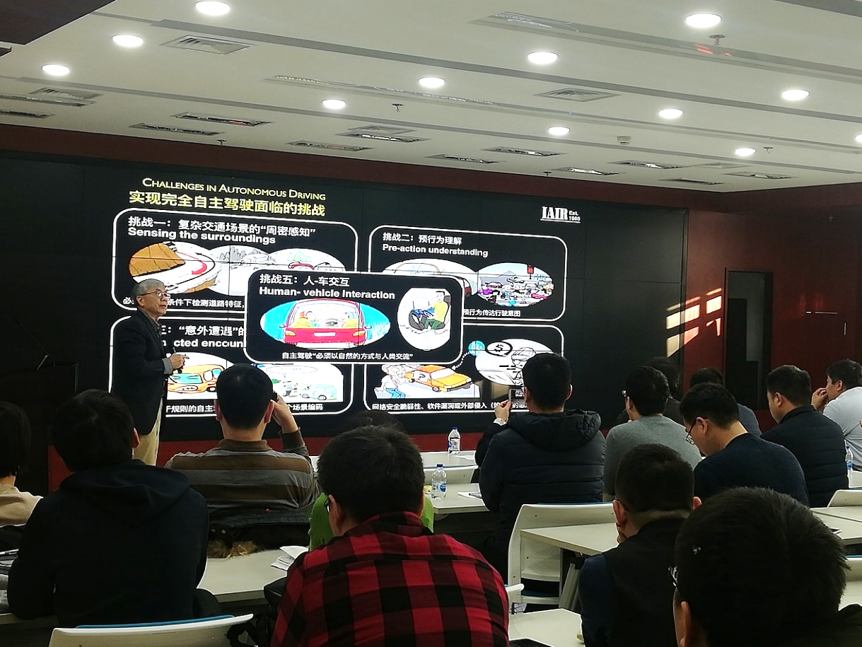 在科研工作方面,作為我國率先開展無人駕駛及輔助安全駕駛的研究團(tuán)隊(duì)之一,鄭南寧介紹了目前無人駕駛的研究現(xiàn)狀,深入分析了無人駕駛汽車要適應(yīng)復(fù)雜的交通環(huán)境仍面臨的五大挑戰(zhàn)。他分享展示了團(tuán)隊(duì)研發(fā)的無人駕駛汽車在中國智能車挑戰(zhàn)賽上的精彩表現(xiàn),其在城鄉(xiāng)道路、高架快速道路以及高架快速道路的真實(shí)交通流狀態(tài)下的匯入車流和動態(tài)超車等復(fù)雜路況下能夠平穩(wěn)駕駛。